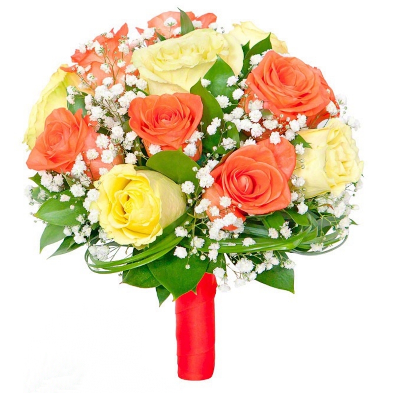 Букет состоит из 8 коралловых роз, 7 желтых роз, 4 гипсофила, зелень, лента.