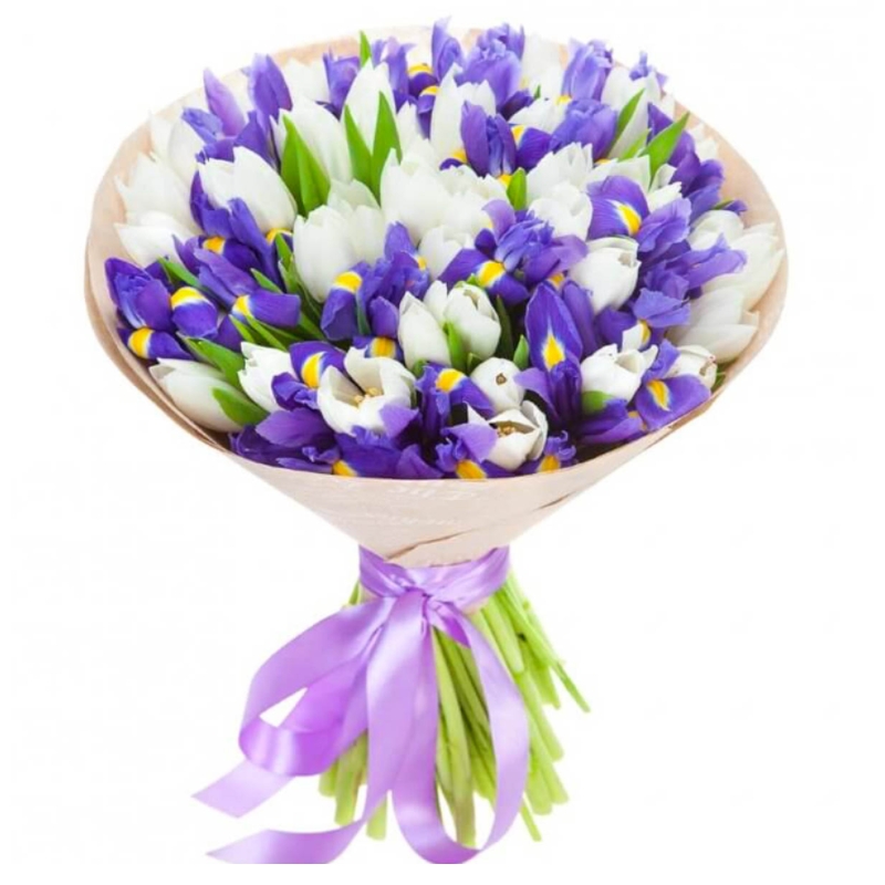 Букет состоит из 26 ирисов, 25 белых тюльпанов, крафт, атласная лента.