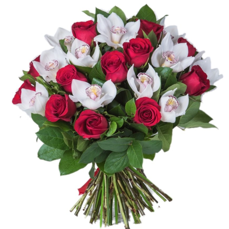 Букет состоит из 13 красных роз, 12 белых орхидей, салал, прозрачная упаковка, атласная лента.